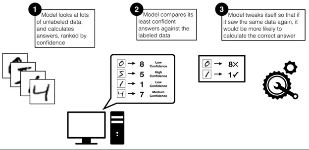 Active learning uses mathematical techniques to prioritize what data the SME needs to label given the current state of the analytic model. Instead of asking SMEs to label all the data upfront, active learning prioritizes which data the model is most confused about at that point in time and requests labels for just that data. The model then trains a little bit on the freshly labeled data, and then again asks for SME assistance in labeling the new “most confusing” data (i.e. Is that a “4” or a “9” in Figure 4?).