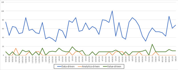 I hate it when I hear senior executives state that they want to become data-driven, as if somehow having data is value in of itself. Now, one can hardly blame the unenlightened executive whose only perspectives on data are associated with statements like “Data is really the new oil” (Wall Street Journal) or “The world’s most valuable resource is no longer oil, but data” (The Economist). The infatuation with “data-driven” versus “value-driven” can be confirmed from Google Trends (Figure 1).