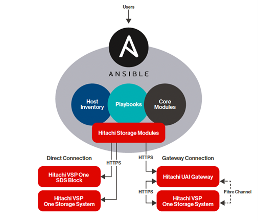 Hitachi integrates natively into Ansible through host inventory, playbooks and core modules.