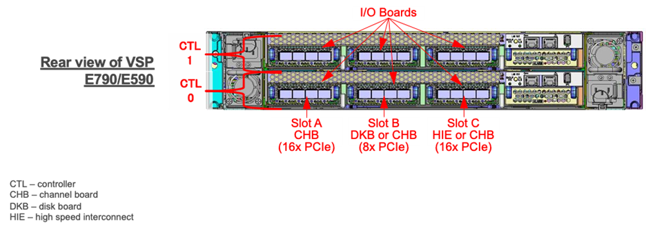 If you plan to install a hybrid VSP E590 or hybrid VSP E790 and plan for DIP migration to the next-generation VSP E series system, you will need to configure the slot A I/O boards for Fibre Channel or iSCSI external connections. Then, configure the slot B I/O boards for the SAS connections, and the slot C I/O boards for high-speed interconnect to the next-generation VSP E series controllers when they become available.