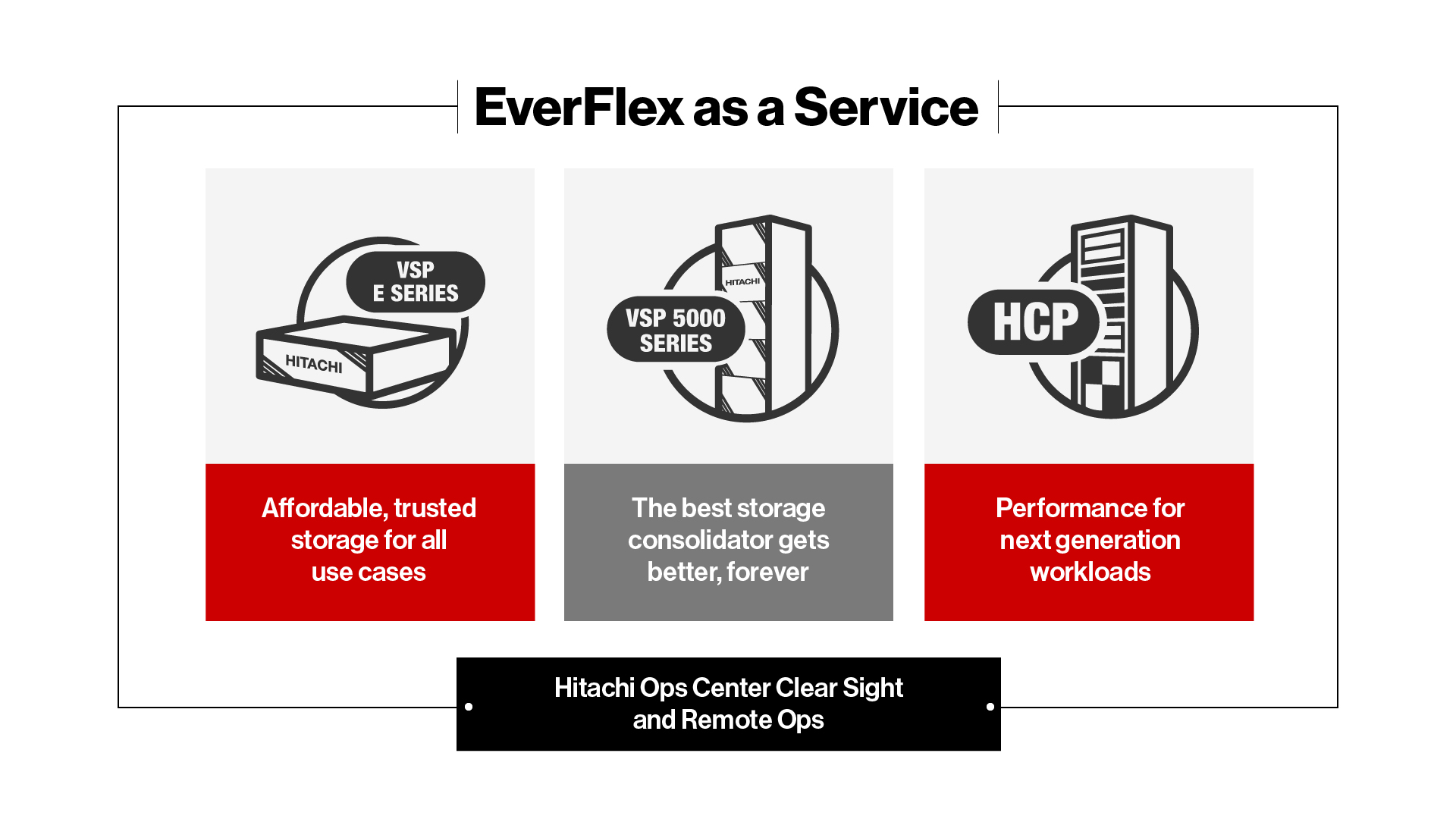 New to the VSP 5200 and VSP 5600, Hitachi Modern Storage Assurance additionally provides seamless upgrades to the next generation VSP technology – simplifying the procurement process for several years. Hitachi Modern Storage Assurance can be included in the original purchase of a new VSP 5200 or VSP 5600 or as part EverFlex. EverFlex is Hitachi Vantara’s as-a-service offering that allows clients to consume hardware, software and Services through a pay-per-use consumption model.