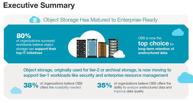 Because object storage is a proven, mature technology already in use in the enterprise, it is not a big leap to realize the value object storage provides in supporting IT initiatives. Object storage solutions can increase data accessibility for both regulatory compliance and data analytics by tapping into unstructured data, unlocking the value of that data. Unstructured data, according to Harvard Business Review, accounts for 80% of total data in an organization with less than 1% being used.2 In fact, just a 10% increase in data accessibility will result in more than $65 million in additional net income for the typical Fortune 1000 company, according to a recent Forbes article.3 More data, plus faster access means more timely and accurate decision making, which leads to improved productivity and the ability to innovate faster while maintaining your budget: win-win-win-win.