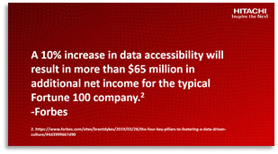 Hitachi Vantara recognizes the value object storage holds for IT organizations. Our Hitachi Content Platform (HCP) can support new workloads with performance optimized configurations and supports the need for cloud storage, workload optimization, next generation file services and backup to object storage in one solution. And having access to more data means having access to more value.
