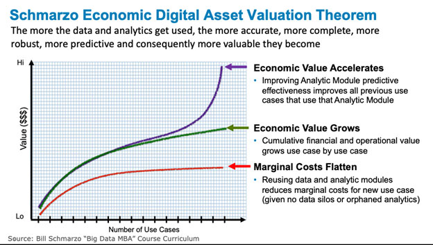That’s the real breakthrough, game-changing concept here – the more that the organization uses the data and analytics, the more accurate, more complete, more robust, and more valuable those digital assets become. Consequently, the economics of these digital assets are simultaneously driving down marginal costs while increasing (and accelerating) the organization’s ability to create new sources of value from these digital assets.