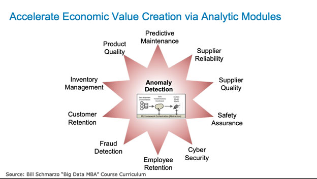 The “Economic Value Curve Acceleration” can be confusing, so let me explain with an example. Let’s say I have created a reusable “Anomaly Detection” analytic module that I use to detect unusual behaviors across multiple use cases such as predictive maintenance, performance optimization, supplier reliability, supplier quality, fraud and customer and employee retention. If I improve the predictive capabilities of the “Anomaly Detection” analytic module for one use case (say predictive maintenance), then every other use case that uses that same “Anomaly Detection” analytic module gets improved performance (more accurate predictions and prescriptive recommendations) at near zero marginal cost (see Figure 2).