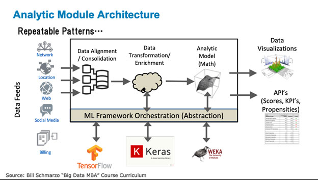 · Analytic Modules. Reusable analytic modules can be created for the most common analytic needs (such as anomaly detection, remaining useful life, operator effectiveness, likelihood to recommend, predictive customer lifetime value) that can be cobbled together like lego blocks (using technologies such as Docker containers and Kubernetes) to address higher-value business and operational use cases (such as reducing operational downtime, improving on-time delivery, reducing obsolete and excessive inventory, improving customer retention, and reducing unplanned hospital re-admissions). See the blog “Driving AI Revolution with Pre-built Analytic Modules” for more details on reusable Analytic Models (see Figure 5).
